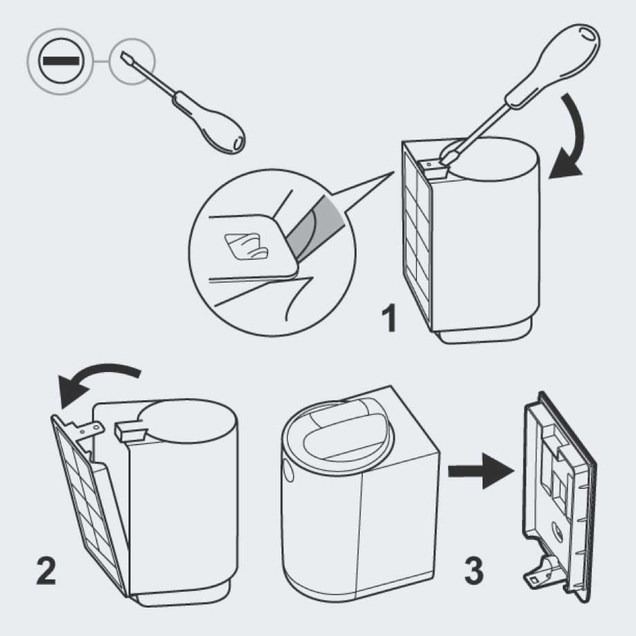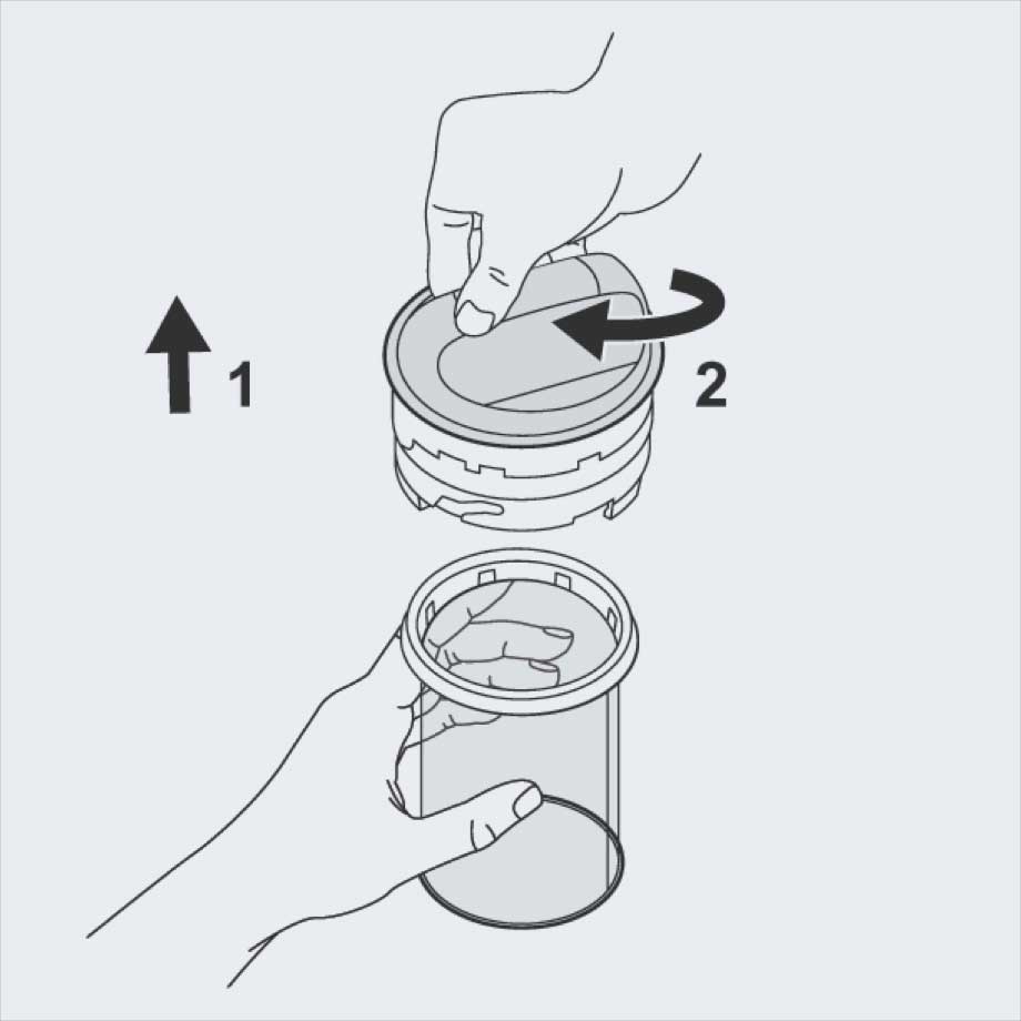Atveriet filtru, pagriežot vāku pretēji pulksteņrādītāja virzienam virzienā no bloķēšanas simbola uz atbloķēšanas simbolu (simbols ir redzams filtra korpusa priekšpusē, kā parādīts 2. attēlā), un paceliet vāku.