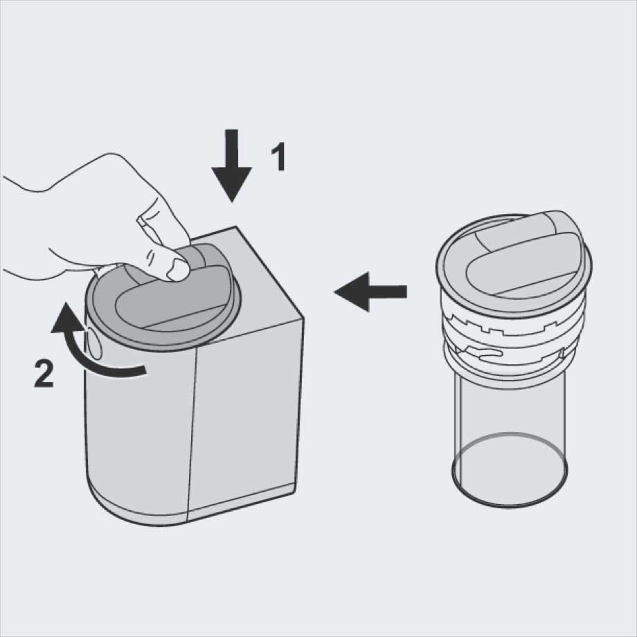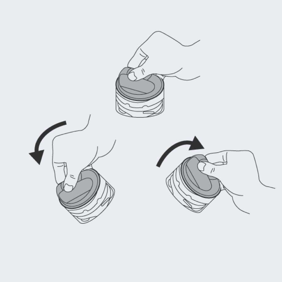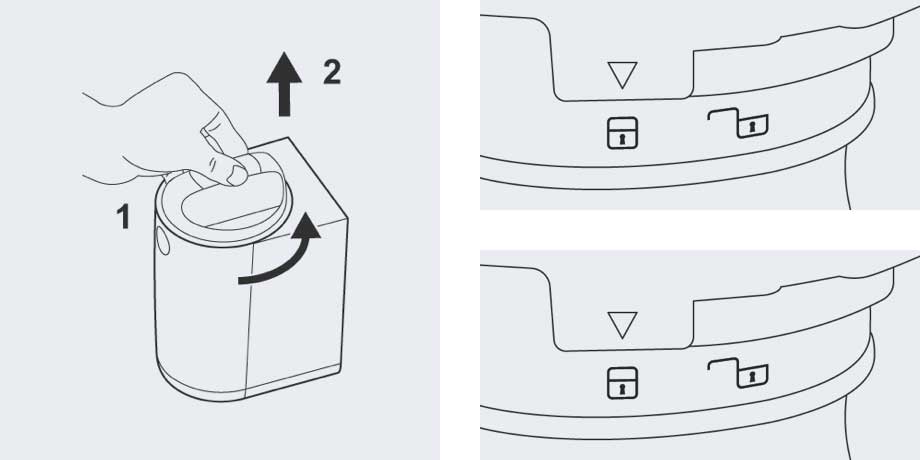 2. Ar vienu roku turiet kārtridžu un tad ar otru roku pagrieziet vāku pulksteņrādītāja virzienā – virzienā no atbloķēšanas simbola uz bloķēšanas simbolu.